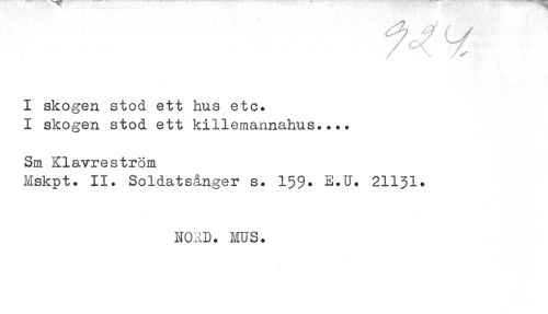 //// I skogen stod ett hus etc. //// I skogen stod ett killemannahus.... //// Sm Klavreström //// Mskpt. II. Soldatsånger s. 159* E.U. 21131. //// NORD. MUS. ////