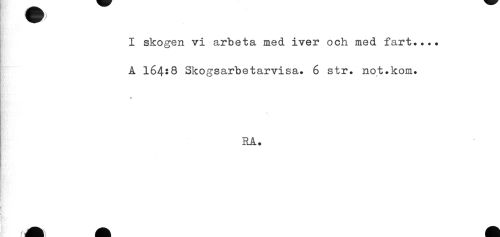 //// I skogen vi arbeta med iver och med fart.... //// A 164:8 Skogsarbetarvisa. 6 str. not.kom. //// * //// RA. ////