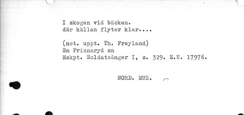 //// I skogen vid bäcken. //// där källan flyter klar.... //// (not. uppt. Th. Freyland) //// ! Sm Frinnaryd sn //// I Mskpt. Soldatsånger I, s. 329* E.U. 17976. //// !f //// M-' //// & //// NORD. ms. ^ ////