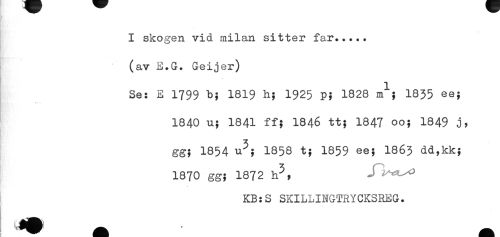 //// I skogen vid milan sitter far..... //// (av E.G. Geijer) //// Se: E 1799 b; 1819 h; 1925 p; 1828 m^*; 1835 ee; //// I840 u; 1841 ff; 1846 tt; 1847 00; I849 j, //// gg; 1854 u^; 1858 t; 1859 ee; I863 dd,kk; //// 1870 gg; 1872 h^, Jl^o //// KB:S SKILLINGTRYCKSREG. //// * ////
