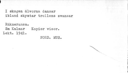 //// I skogen älvorna dansar //// ibland skymtar trollens svansar //// Räkneramsa. //// Sm Kalmar Kopior visor. //// Lekt. 1941. //// NORD. ms. //// 'Tv. //// H //// s //// ! //// ] //// - //// b //// i ////