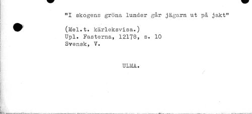 //// "I skogens gröna lunder går jägarn ut på jakt" //// (Hel.t. kärleksvisa.) //// Upl. Fastema, 12178, s. 10 //// Svensk, V. //// T ^ //// ULMA. //// HM'" //// K. ////