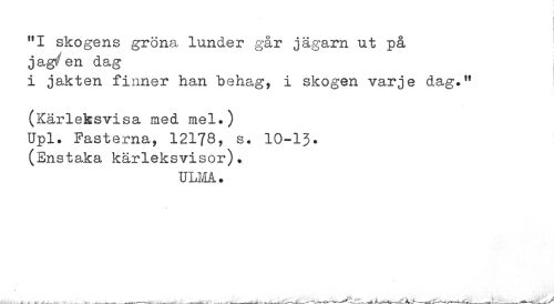 //// "I skogens gröna lunder går jägarn ut på //// jag^en dag //// i jakten finner han behag, i skogen varje dag." //// (Kärleksvisa med mel.) //// Upl. Fastema, 12178, s. 10-13. //// (Enstaka kärleksvisor). //// ULNA. ////