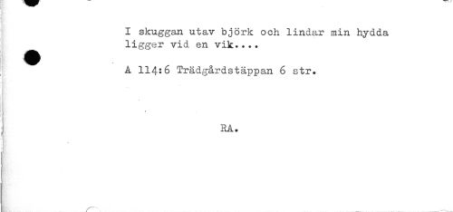 //// K //// I skuggan utav björk och lindar min hydda //// ligger vid en vik.... //// ! A 114:6 Trädgårdstäppan 6 str. //// - //// ! //// f/ //// 1 RA. //// ! //// ) ////