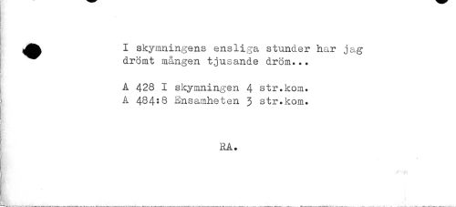 //// ^^ I skymningens ensliga stunder har jag //// drömt mången tjusande dröm... //// ) . //// i //// A 428 I skymningen 4 str.kom. //// A 484:8 Ensamheten 3 str.kom. //// ! RA. //// S. __ ////