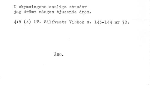 //// I skymningens ensliga stunder //// jag drömt mången tjusande dröm. i //// 4:8 (4) LT. Silfvasts Visbok s. 143-144 nr 78. //// < //// t //// ÅBO. //// < ////