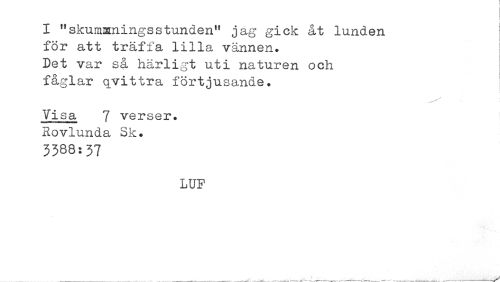 //// t //// r //// I "skumianingsstunden" jag gick åt lunden //// för att träffa lilla vännen. //// Det var så härligt uti naturen och //// fåglar qvittra förtjusande. //// Visa 7 verser. //// Rovlunda Sk. //// 3388:37 //// LUF ////