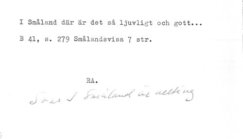//// I Småland där är det så ljuvligt och gott... //// B 41, s. 279 Smålandsvisa 7 str. //// RÅ. //// t //// ) ////