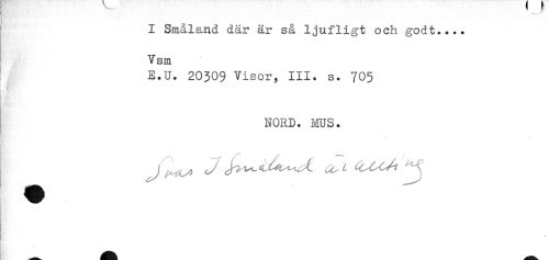 //// I Smålsjfid där är så ljufligt och godt.... //// Vsm //// E.U. 20309 Visor, III. s. 705 //// NORD. ms. //// ! //// R* ////