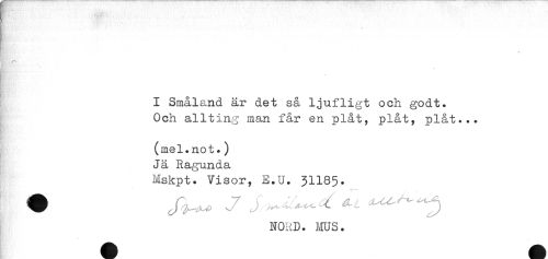 //// I Småland är det så ljufligt och godt. //// Och allting man får en plåt, plåt, plåt... //// (mel.not.) //// Jä Ragunda //// Mskpt. Visor, E.U. 3II85. //// NORD. MUS. ////