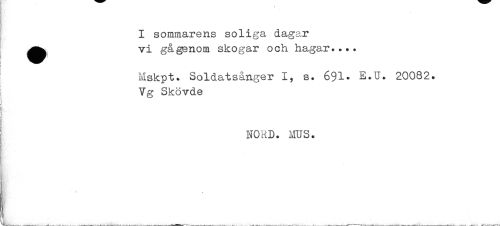 //// I sommarens soliga dagar //// ^^ vi gågpnom skogar och hagar.... //// } //// Mskpt. Soldatsånger I, s. 691. E.U. 20082. //// ! Vg Skövde //// t //// t //// NORD. MUS. ////