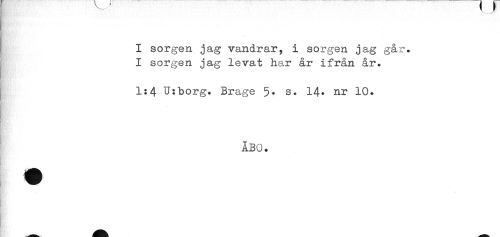 //// I sorgen jag vandrar, i sorgen jag går. //// I sorgen jag levat har år ifrån år. //// 1:4 U:borg. Brage 5. s. 14. nr 10. //// ÅBO. ////