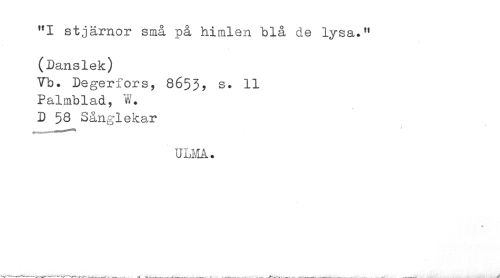 //// "I stjärnor små på himlen blå de lysa." //// (Danslek) //// Vb. Degerfors, 8653? s. 11 //// Palmblad, W. //// D 53 Sånglekar //// ULMA. ////