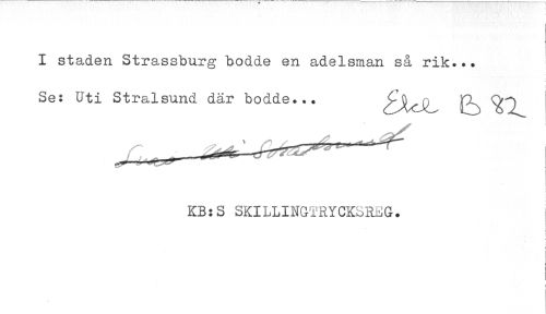 //// I staden Strassburg bodde en adelsman så rik... //// Se: Uti Stralsund där bodde... ^IX^v //// KB:S SKILLINGTRYCKSREG. //// t //// ! ////