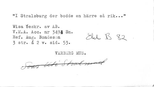 //// f //// "I Stralsburg der bodde en härre så rik..." //// Wisa Heskr. av AB. //// V.M.A. Acc. nr 34% Sn. //// Ref. Aug. Bondeson (^tjL ^^ - ! //// 3 str. å 2 v. sid. 53* //// VARBERG MS. //// -tR //// ...... .......... ....... J ////