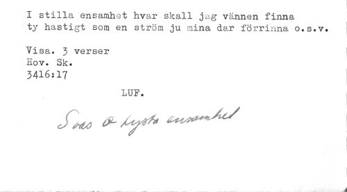 //// I stilla ensamhet hvar skall jag vännen finna //// ty hastigt som en ström ju mina dar förrinna o.s.v. ! //// Visa. 3 verser ! //// Hov. Sk. //// 3416:17 //// LUF. //// I ////