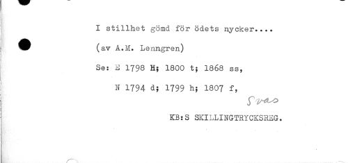 //// I stillhet gömd för ödets nycker.... //// ] (av A.M. Lenngren) //// I Se: E 1798 H; 1800 t; 1868 ss, //// N 1794 d; 1799 h; 1807 f, //// a . //// ^ KB:S SKILLINGTRYCKSREG. //// & //// - . . , ////