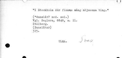 //// "I Stockholm där finnas mång nöjsamma ting." //// ("danslåt? med. mel.) //// Vgl. Seglora, 8848, s. 21. //// Stälberg. //// (Danslåtar) //// 325. //// ULMA. J ////