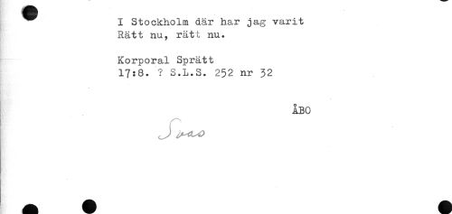 //// I Stockholm där har jag varit //// Rätt nu, rätt nu. //// Korporal Sprätt //// 17:8. ? S.L.S. 252 nr 32 //// j ÅBO //// il) r i! ////
