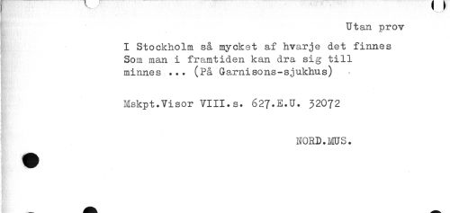 //// Utan prov //// I Stockholm så mycket af hvarje det finnes //// Som man i framtiden kan dra sig till //// minnes ... (På Garnisons-sjukhus) //// Mskpt.Visor VIII.s. 627.E.U. 32072 //// NORD. ms. ////