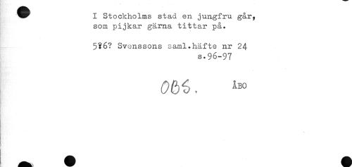 //// I StockhoIms stad en jungfru går, //// som pijkar gärna tittar på. //// 5?6? Svenssons saml.häfte nr 24 //// s.96-97 //// B' ////