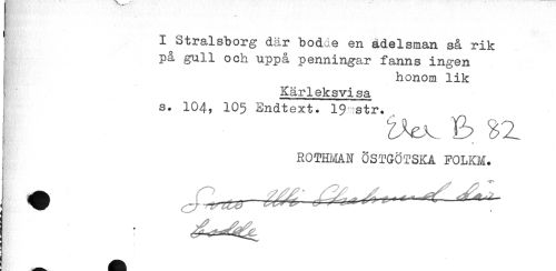 //// ] //// ) ^ //// I Stralsborg där bodde en adelsman så rik //// I på gull och uppå penningar fanns ingen //// j honom lik //// Kärleksvisa //// s. 104, 105 Endtext. l^istr. //// ! ^ & //// i ROTHiAN ÖSTGÖTSKA FOLKM. ////