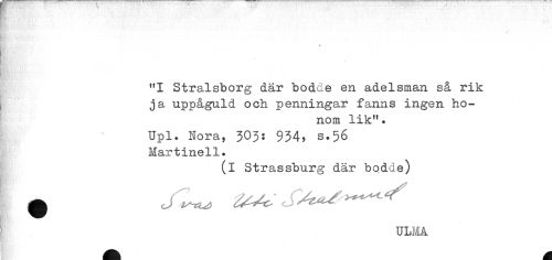 //// b ''/-k' //// "I Stralsborg där bodde en adelsman så rik //// i ja uppåguld och penningar fanns ingen ho- //// nom lik". //// Upl. Nora, 303: 934^ s.56 //// Martineli. //// (i Strassburg där bodde) //// ULMA ////