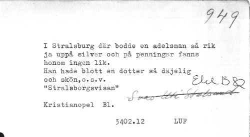 //// I Stralsburg där bodde en adelsman så rik //// ja uppå silver och på penningar fanns //// honom ingen lik. //// Han hade blott en dotter så däjelig //// och skön,o. s.v. , //// "Stralsborgsvisan" _ , . ^ ^ ! //// Kristianopel Bl. //// t //// * ? //// 3402.12 LUF //// * //// ! ////