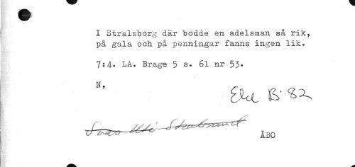 //// I Stralsborg där bodde en adelsman så rik, //// på gala och på penningar fanns ingen lik. //// 7:4. LA. Brage 5 s. 61 nr 53. //// * //// } //// { ////
