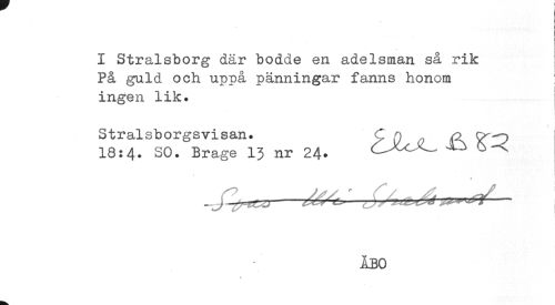 //// I Stralsborg där bodde en adelsman så rik //// På guld och uppå pänningar fanns honom //// ingen lik. //// Stralsborgsvisan. ^ i ^ /p //// 18:4. SO. Brage 13 nr 24. d^xJ^ ^ ^^ //// ÅBO ////