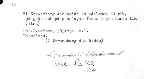 //// "I Stralsborg där bodde en adelsman så rik, //// på gods och på penningar fanns ingen honom lik." //// (Visa) //// Upl.O.Löfsta, 303:638, s.l. //// Hesselman. //// (i Strassburg där bodde) //// ULMA ////