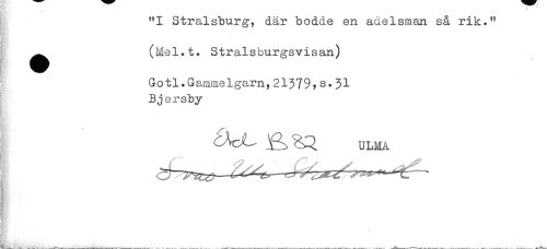 //// 4t.' //// "I Stralsburg, där bodde en adelsman så rik." //// ^^ (Mel.t. Stralsburgsvisan) //// Gotl.Gammelgarn,21379? s.31 //// Bjersby //// M/-' //// , ULMA //// ..... . . . . . ////