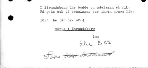 //// : //// I Strandsborg där bodde en adelsman så rik. //// På gods och på penningar var ingen honom lik. //// ^ 18:4 LA INE 62. nr.4 //// Maria i Strandsbor^ //// ÅBO ////