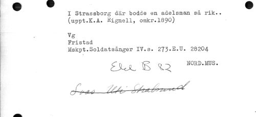 //// I Strassborg där bodde en adelsman så rik.. //// (uppt.K.A. Rignell, omkr.1890) //// Vg //// Fristad //// [ Mskpt.Soldatsånger IV.s. 273*E*U* 28204 ////