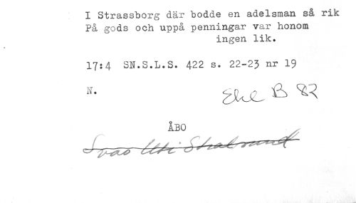 //// I Strassborg där bodde en adelsman sa riK //// På gods och uppå penningar var honom //// ingen lik. //// 17:4 SN.S.L.S. 422 s. 22-23 nr 19 ////