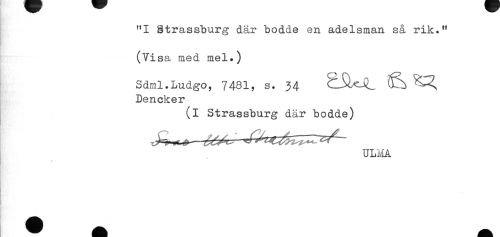 //// (Visa med mel.) //// Sdml.Ludgo, 7481, s. 34 //// Dencker //// (i Strassburg där bodde) //// ^ ^^ J ^^ ULMA //// K- - //// R.. ////