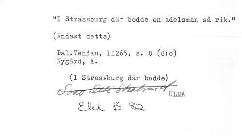 //// "I Strassburg där bodde en adelsman så rik." //// (Endast detta) //// Dal.Venjan, 11265, s. 8 (8:0) //// Nygård, A. //// (i Strassburg där bodde) ////