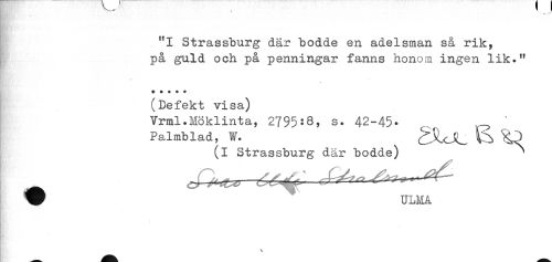 //// "I Strassburg där bodde en adelsman så rik, //// på guld och på penningar fanns honom ingen lik." //// f //// (Defekt visa) //// Vrml.Möklinta, 2795:8, s. 42-45- * //// Palmblad, W. S^LUL ^ //// (i Strassburg där bodde) ^ //// \ ////