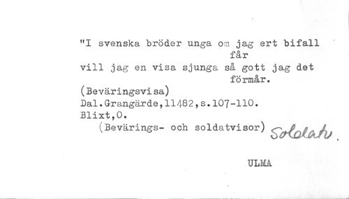 //// "I svenska bröder unga om jag ert bifall //// får //// vill jag en visa sjunga så gott jag det //// fö rmår. //// (Beväringsvi sa) //// Dal.Grangärde,11482,s.107-110. //// Blixt,0. //// (Bevärings- och soldatvisor) jfly^^^ //// ULMA ////