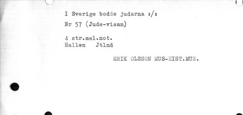 //// I Sverige bodde judarna :/: //// Nr 57 (Jude-visan) //// 4 str.mel.not. //// Hallen Jtlnd //// ERIK OLSSON mJS-HIST.MUS. ////