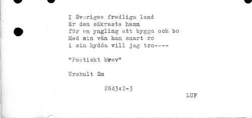 //// I Sveriges fredliga land //// är den säkraste hamn //// ^^ för en yngling att bygga och bo //// Med sin vän han snart ro //// i sin hydda vill jag tro---- //// "Poetiskt bkev" //// Urshult Sm //// ! //// W6'7' //// ) //// 2843:2-3 //// LUF //// _____.___ ////