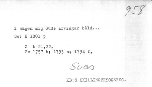 //// - //// .. - ' - ! //// i //// < //// t //// I sägen mig Guds arvingar båld... //// Se: E 1801 p //// Z b 21,22, //// Zz 1757 b; 1793 c; 1794 f, //// KB:S SKILLINGTRYCKSREG. ////