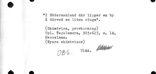 //// "I Södermanland där ligger en by //// å därved en liten stuga". //// (Skämtvisa, grovkorning) //// Upl. Tegelsmora, 303:613, s, 14y //// Hesselman. //// (Nyare skämtvisor) ////