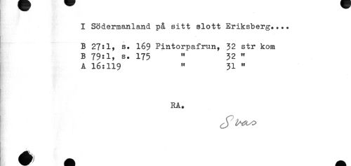 //// I Södermanland på sitt slott Eriksberg.... //// B 27:1^ s. 169 Pintorpafrun, 32 str kom //// B 79:1, s. 175 " 32 " //// A 16:119 " 31 " //// RA. //// * ////