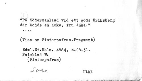//// - //// "På Södermanland vid ett gods Eriksberg //// där bodde en änka, fru Anna." //// .... //// (Visa om Pintorpafrun.Fragment) //// Sdial.St.Malm. 4884, s.28-31. //// Palmblad W4 //// (Pintorpafrun) //// ^^ ULMA ////