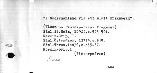 //// "I Södermanland vid ett slott Eriksberg". //// * , //// (Visan om Pintorpafrun. Fragment) //// Sdml.St.Malm, 10922,8.595-596. //// Nordin-Grip, 1. //// Sdml.Österåker, 12739yS.849* //// v, ^ Sdml.Torsa,14830,s +455-57* //// Nordin-Grip,I. //// ^^ (Pintorpaf run) ////