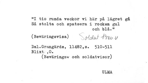 //// "I tio runda veckor vi här på lägret gå //// Så stolta och spatsera i rocken gul //// och blå." //// (Beväringsvisa) j/ //// Dal.Grangärde, 11482,s. 510-511 //// Blixts ,0. //// (Beväringsv och soldatvisor) ////