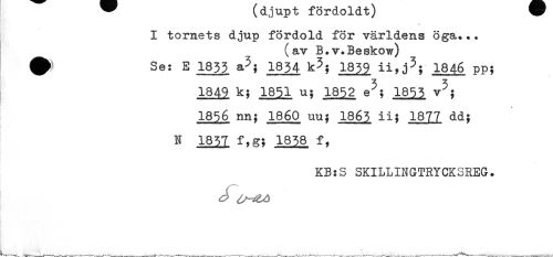//// \ v.. ? ^^ c^ v v ^ v y ^^^^ //// % t j jt. ^ * //// *** //// I tornets djup fördold för världens öga... //// (av B.v.Beskow) //// # Se: E 1833 &3; I834 k3; I839 ii,j^; 1846 pp; //// 1849 k; j^l u; 1^2 e^; j^H v^ //// 1856 nn; 1860 uu; 1863 ii; 1877 dd; //// N 1837 f,g; 1838 f, //// KB:S SKILUNGTRYCKSREG. //// - ////