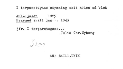 //// I torparstugans skymning satt nöden så blek //// Jul-l.lusen 1825 //// Hvarmed skall jag... 1843 //// jfr. I torparstugans... //// Julia Chr.Nyberg //// J //// MB SKILD.UNIK ////