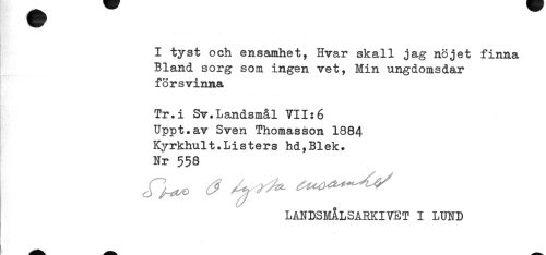//// I tyst och ensamhet, Hvar skall jag nöjet finna //// Bland sorg som ingen vet, Min ungdomsdar //// försvinna //// Tr.i Sv.Landsmål VII:6 //// Uppt.av Sven Thomasson 1884 //// Kyrkhult.Listers hd,Blek. //// Nr 558 //// LANDSMÅLSARKIVET I LUND ////